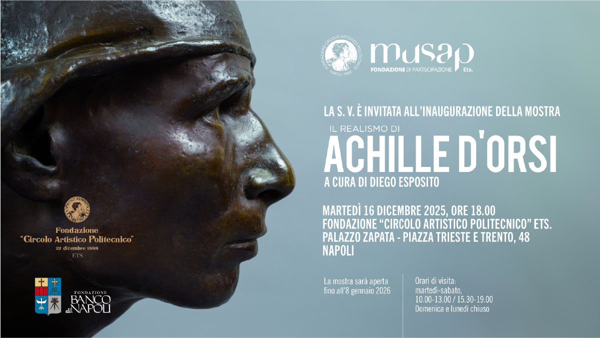 The exhibition dedicated to Achille d’Orsi will open at the museum spaces of the Fondazione "Circolo Artistico Politecnico" ETS, located within the historic Palazzo Zapata (Piazza Trieste e Trento, 48). The event is organized by MUSAP – Fondazione di Partecipazione, an institution dedicated to the preservation and promotion of Neapolitan artistic memory.